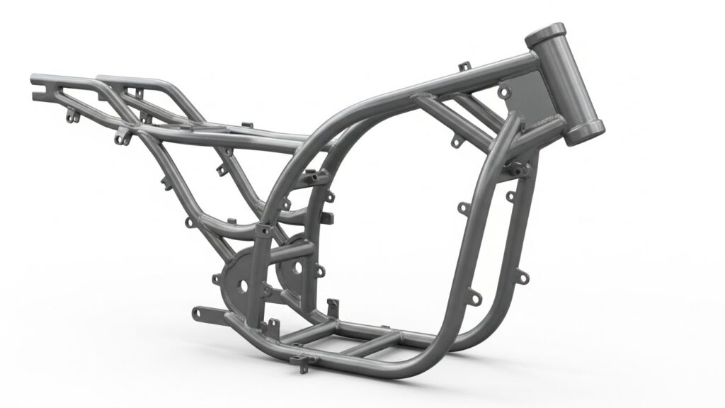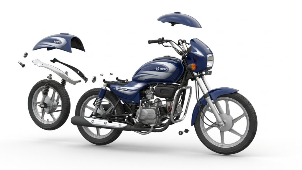 Frame/Chassis 🔹 Crucial Information:The motorcycle’s frame serves as its structural support.Every significant component is fixed to the frame.The frame of Hero Splendor is made of steel tubing.It offers:Stability and StrengthAppropriate equilibriumUnstable and dangerous riding might result from a weak frame.
