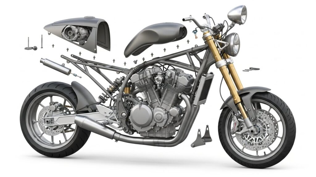 Bonus: A VIEW OF ALL PARTS EXPLODED 🔹 Crucial Information:All of the bike’s components are clearly separated in the exploded image.Aids in comprehension:Procedure for assemblyMaintenance and repairsOften utilized in:Mechanical schematicsInstruction manualsInstructional videosExcellent for technicians and students.