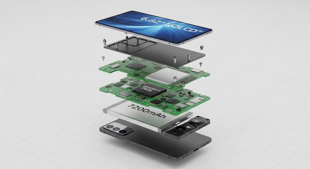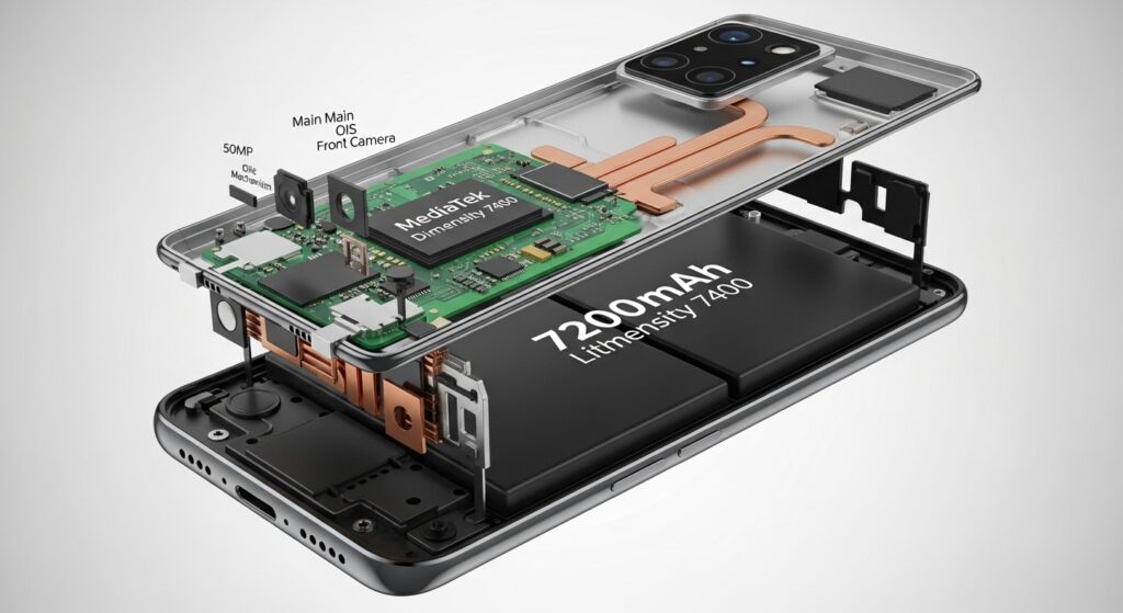 Vivo T5x 5G is powered by MediaTek’s 7400 Turbo chipset with an AnTuTu score of over 1 million points. It packs a 7200mAh battery and supports 44W fast charging. It is also IP68 and IP69 resistant. The phone runs on Android 16.
